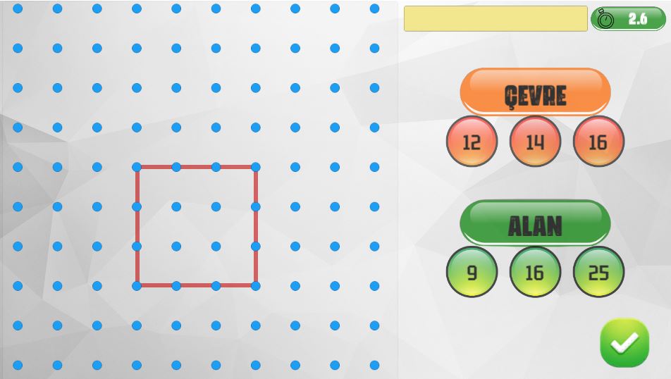 - Zamanla Yarışma: Oyun, her seviyede zaman sınırlarını içerir. Bu, oyuncuların hızlı ve doğru bir şekilde alan ve çevre hesaplamalarını gerçekleştirmelerini sağlar, böylece oyunun zorluk seviyelerini arttırır.